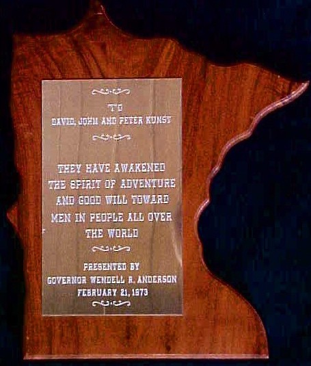 The plaque to the left was presented to the Kunst Brothers after John's death. Governor Wendell R. Anderson proclaimed February 21, 1973 as "KUNST BROTHER'S DAY."