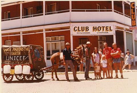 Dave and Pete in front of the Club Hotel in Australia, during 1974.
