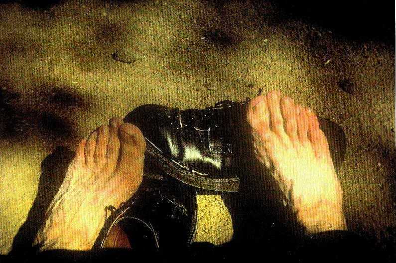 Late in September of 1974 Dave was walking across Northern Iowa about 150 miles from the finish of his awesome feat when he slipped off his shoes and socks. Pointing his camera down he took a picture of the feet that had walked 14,450 miles to circle the land mass of the earth. Also pictured are the last pair of the 21 pair of shoes Dave wore out during his circumambulation.
