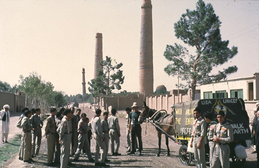 John and Dave are greeted by Afghanistan Boy Scouts as they walk into Herat, Afghanistan.