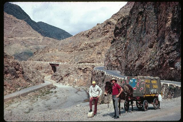 Pete and Dave with the mule and wagon in the Khyber Pass in 1973.